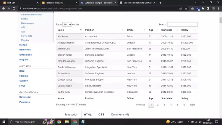 pada elemen tabel ingat harus memiliki properti id dan class yang tepat agar bisa di inisialisasi.